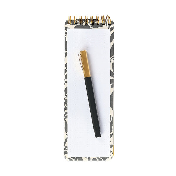 Spiral top bound notebook with pen and pen loop.